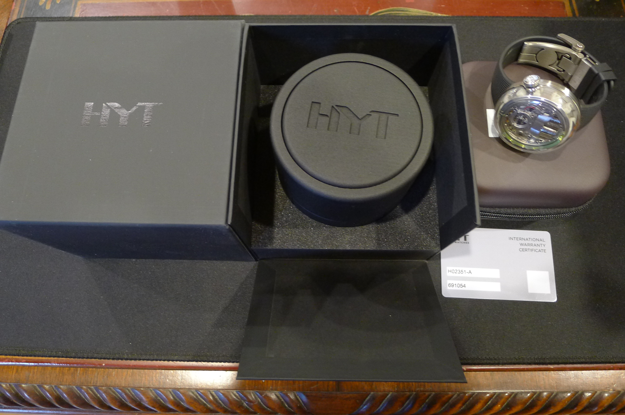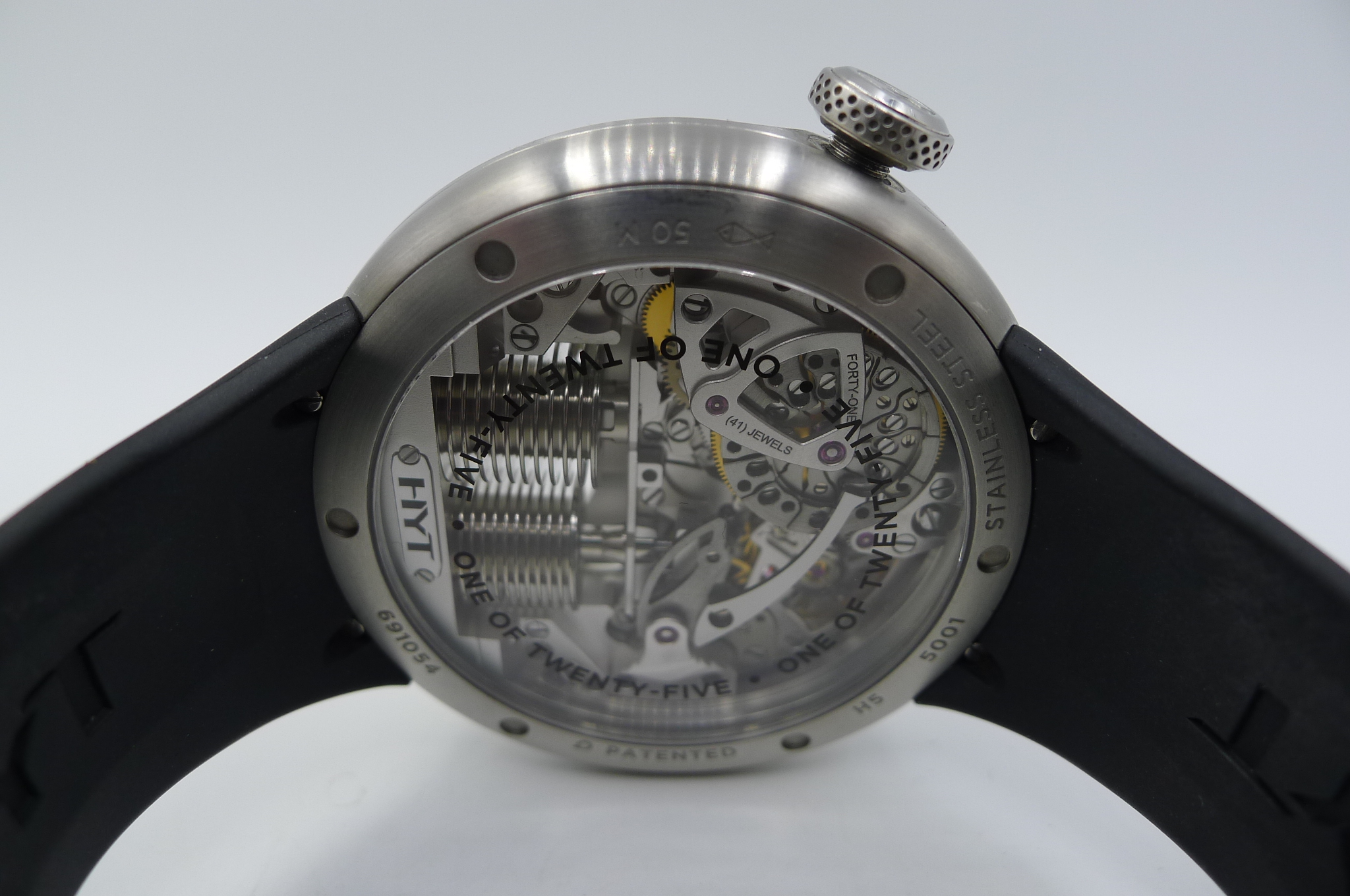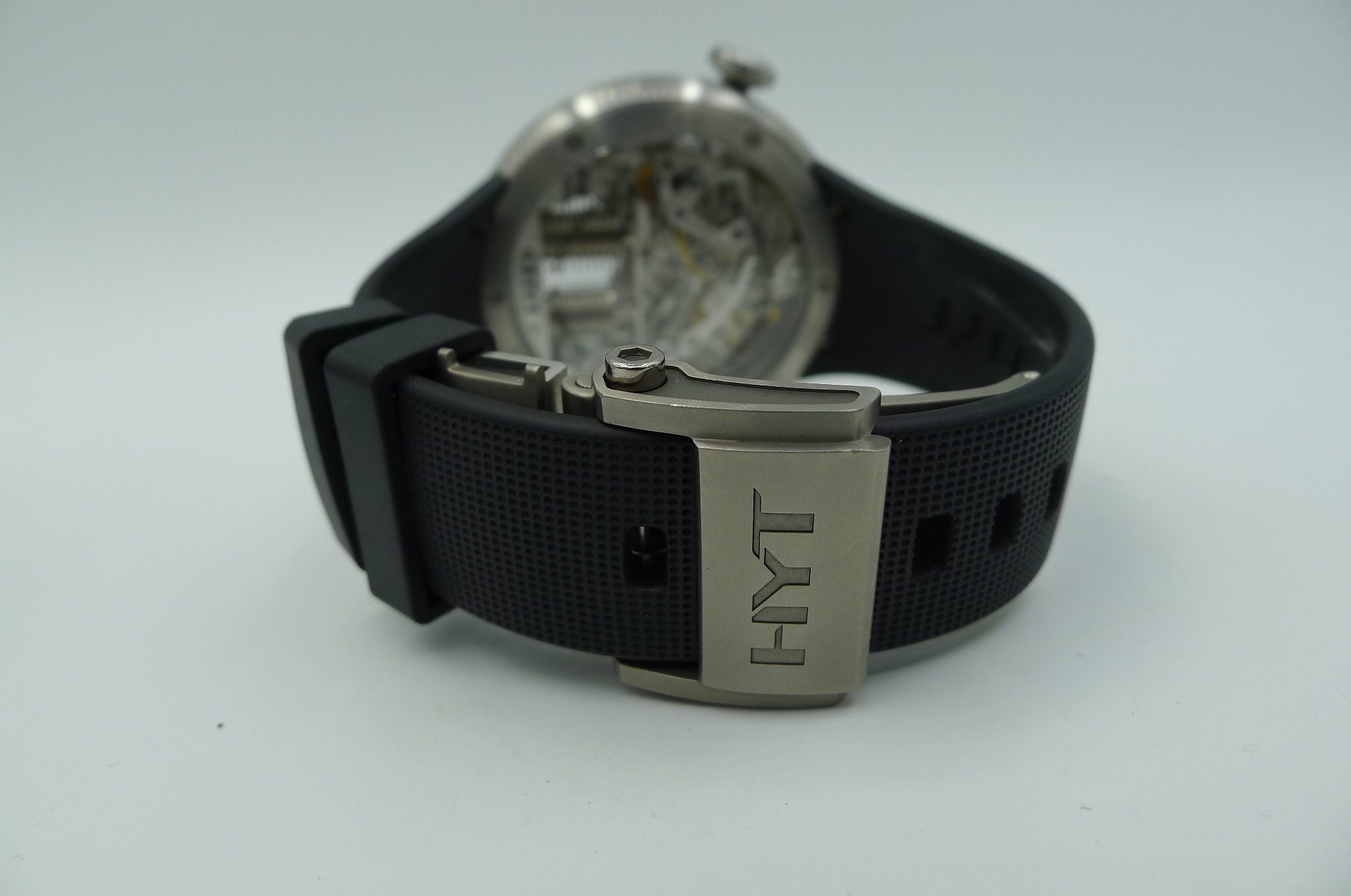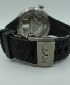 MOVEMENT – MANUAL WIND HYT CALIBER WITH FLUID RETROGRADE HOUR DISPLAY, MINUTES AT 12:00, POWER RESERVE AT 3:00 & SECONDS AT 9:00